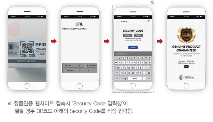 스마트폰의 일반적인 QR코드 앱을 이용하여 Vc-Tag®QR 라벨의 QR코드를 읽어 정품여부를 확인