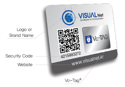 Vc-Tag®QR은 세계 최초로 정품을 쉽게 육안으로 확인이 가능한 정품인증 태그인 Vc-Tag®에 QR코드가 융합되어 있는 정품인증용 라벨입니다.