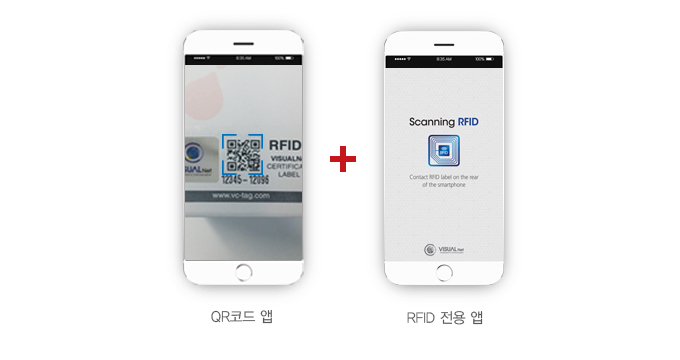 RFID 정품인증 전용 앱 'Vc-CHECK'를 실행하고 RFID 라벨을 스마트폰 뒷면에 접촉시켜 정품여부를 확인